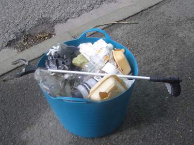 This pick got me to the railway bridge. Luckily no nappies, but the usual mix of 10 plastic bottles, 2 glass bottles, 8 cans, 8 polystyrene fast food boxes, 5 takeaway coffee cups, 3 bits of car, 6 cigarette packets, 1 sock etc.