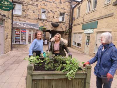 They braved some wet and windy weather to plant up the big new three-tiered planter which replaces the tubs on Kirkgate.