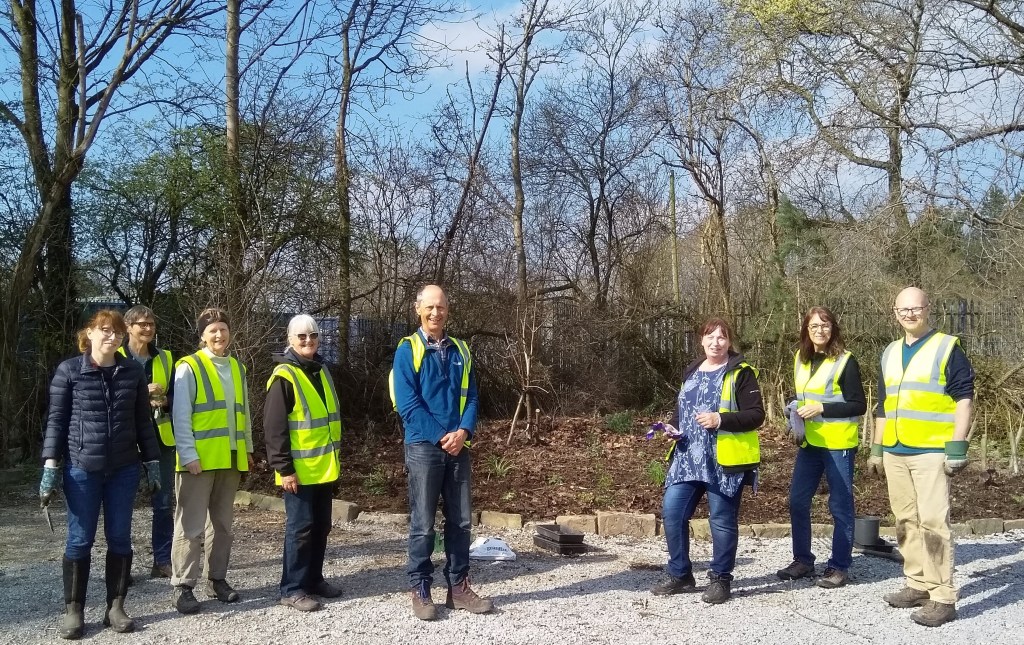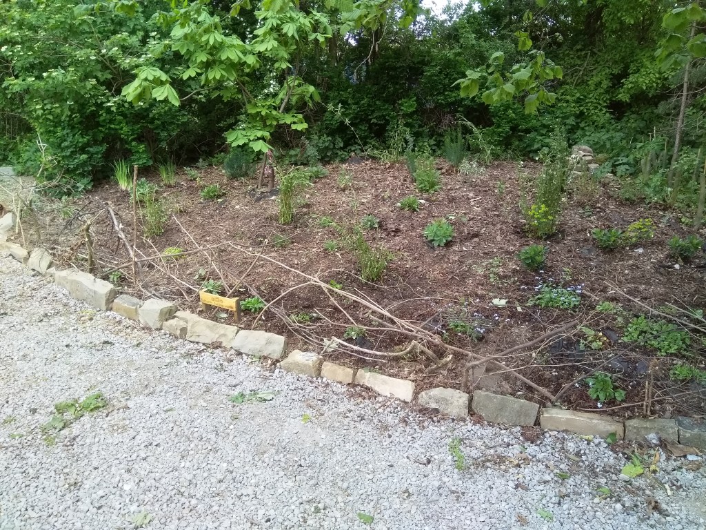First we had to dig over the space and mark it using gifted stones to stop cars parking on it. Then, using leaf mold from the uncleared streets of Otley, plants from our gardens, some re-cycled plants from Leeds Parks (by agreement) and some bought in plants we managed to plant this up. We decided to use the weed surpressing medium to cut down on maintenance and that should stay covered up with the leaf mold. Only time will tell. Let’s hope for a bit of rain as this is an impossible site to keep watered.