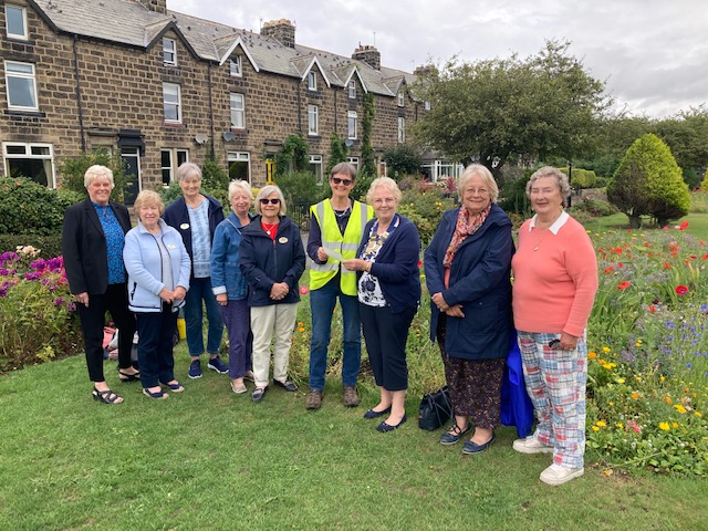 Members gathered in the park to learn about the choice of plants, which were attracting many bees, to hear about the plan for the beds and to present a cheque to Penny Rhodes from the Otley in Bloom in support of the project. The photo shows President Pam Beck presenting the cheque, accompanied by members of the Otley Chevin Club, in front of one of the beds in the park.