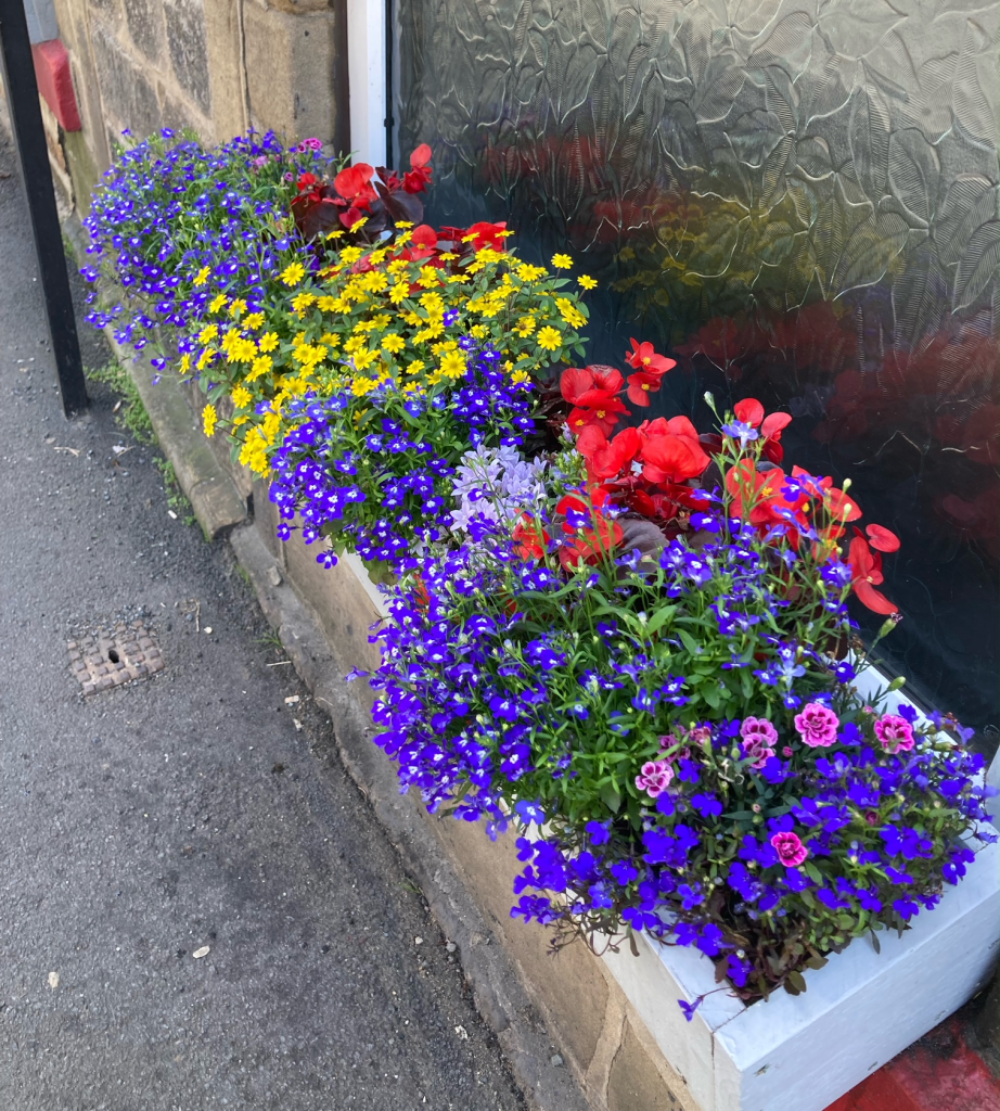 As an experiment OiB developed a simple wooden window box with Otley Maker Space that could fit cleanly into the front windows of houses that open directly onto the street without the need to damage or drill the stone frames. We ended up providing eleven to North Parade, fully planted up, for a nominal £5. Our eleven seem to have stimulated neighbours into adding a further two of their own. We believe this has enhanced the colourful displays along this busy street.
